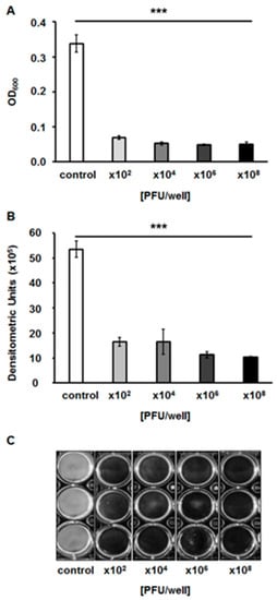 Bacterial biofilm density after a 24-h incubation with vB_EfaS-271 phage lysate added to final titers of 102, 104, 106 or 108 PFU/well. The results were estimated by measuring the optical density at a wavelength of 600 nm of the resuspended biofilms (A) or quantified densitometrically using the Quantity One program (B) from bacterial biofilm pictures (C). Error bars indicate the SD from triplicate experiments. Statistically significant differences (p < 0.001 in the t-test) between control and analyzed samples are marked by asterisks (***).