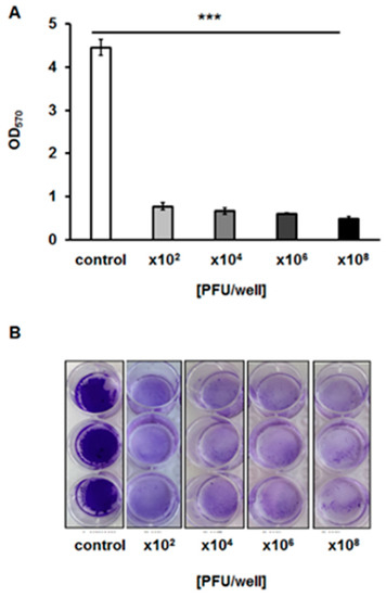 Biofilm biomass after a 24-h incubation with phage vB_EfaS-271 added to final titers of 102, 104, 106 or 108 PFU/well, as analyzed by the crystal violet staining method and shown as optical density values measured at a wavelength of 570 nm (A) or photographed (B). The results are presented as the mean values ± SD from three independent experiments. Statistically significant differences (p < 0.001 in the t-test) between control and analyzed samples are marked by asterisks (***).