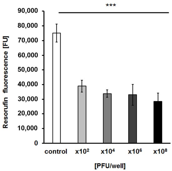 Biofilm cells were prepared and incubated with vB_EfaS-271 lysate as described in Section 4.11. The resazurin assay was conducted according to the protocol described elsewhere [82]. First, the liquid medium was removed from each well. Next, the surface-attached cells were suspended in 1 mL of PBS. Then, resazurin solution (Sigma-Aldrich) was added to each well to a final concentration of 24 μg/mL. The plates were gently shaken and incubated in an EnSpire multimode plate reader for 50 min at room temperature. The fluorescence of the produced resorufin (λexc = 570 nm and λem = 590) was measured every 5 min. The results are presented as fluorescent units (FU). The procedure was repeated three times.