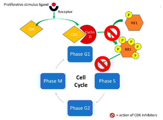 The complexes composed by cyclins and cyclin-dependent kinases (CDKs) are critical checkpoints in the progression of the cell cycle and some mutations on this pathway have been demonstrated to be involved in cancer []. In breast cancer, CDK4 and CDK6 inhibitors (CDKis) have emerged as key players in the cellular proliferation through different pathways [,]. The mechanism of action of CDKis is shown in Figure 1.