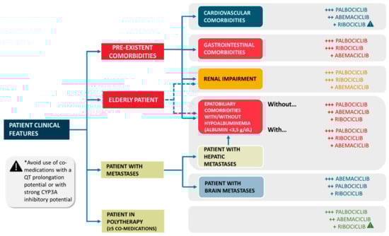 The aim of this review is to discuss possible meaningful clinical interactions between CDKis and co-administered drugs (drug-drug interactions, DDIs), pharmacogenetics (drug-gene interactions, DGIs) and pathophysiological conditions that may occur at all levels of ADME. The differences in CDKis pharmacological features could be further exacerbated by decreasing or increasing their oral bioavailability, distribution, and/or toxicity. With regard to all these aspects, not considered in CDKis phase III-IV trials, we aim to focus on patient’s features (DDIs, DGIs, and pathophysiological conditions) to foster a more personalized use of these agents [].
