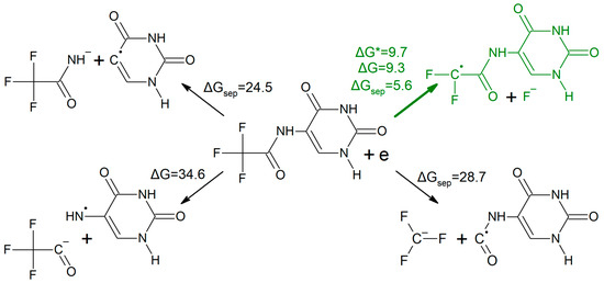 It is worth emphasizing that an increased electron affinity itself is not a sufficient condition for a molecule to be an efficient radiosensitizer. Besides the ability to accept an excess electron, which is necessary to trap a solvated electron, a potential radiosensitizer has to be prone to electron attachment-induced dissociation. In Figure 1, the energetic profile (in the free energy scale) for the possible DEA process in CF3CONHU, obtained at the DFT level, is depicted. We considered the cleavage of particular bonds—C5–N, N–C, C–CF3 and C–F—in the substituent.