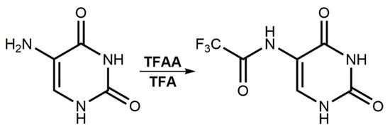 In view of the promising results described above, we decided to obtain CF3CONHU. The synthesis of the above-mentioned compound relies on the acylation reaction, according to Figure 2. The title compound has been obtained via the reaction of 5-aminouracil with trifluoroacetic anhydride (TFAA) in trifluoroacetic acid (TFA) [28].