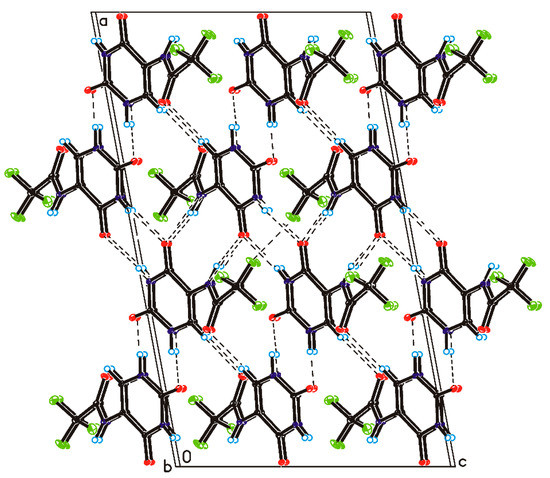 Crystal packing of 5-(N-trifluoromethylcarboxy) aminouracil viewed along the b-axis (hydrogen bonds are represented by dashed lines).