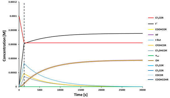 Kinetic curves for particular species involved in the radiolysis of a CF3CONHU solution (R = NHU). The vertical broken line indicates the moment at which the X-ray source was turned off. The system of kinetic equations (Equation S1) has been integrated for 3 × 104 s.