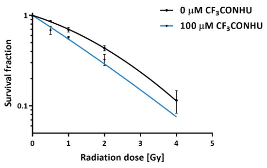 PC3 cells (human prostate cancer cells obtained from Cell Line Service, Eppelheim, Germany) were treated with CF3CONHU in a concentration of 10−4 M and plated on 60 mm dishes in a density of 106 cells per dish. After 48 h incubation (RPMI medium supplemented with 10% fetal bovine serum and with antibiotics (streptomycin and penicillin) at a concentration of 100 U mL−1, 37 °C, 5% CO2) the cells were exposed to 0.5, 1, 2 and 4 Gy, with the use of a Cellrad X-ray cabinet (Faxitron X-ray Corporation, 1.27 Gy min−1, 130 kV, 5.0 mA). After 6 h (the assay was performed in the variant with delayed plating after treatment to allow for repair processes [56]), the cells were trypsinized and plated on 100 mm dishes in a density of 800 cells per dish. The cell culture and irradiations have been performed under normoxic conditions. After 13 days, the formed colonies were fixed with 6.0% (v/v) glutaraldehyde and 0.5% crystal violet. The stained colonies were counted manually, and the colony size was evaluated using an inverted fluorescence microscope (Olympus, IX73, Tokyo, Japan). The data were analyzed, and survival curves were plotted following the linear-quadratic equation using the GraphPad Prism Software (San Diego, CA, USA). Plating efficiencies and survival fractions are shown in Table S3 in the Supplementary Materials.