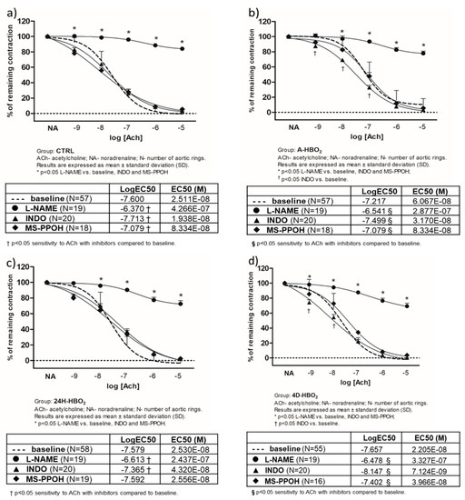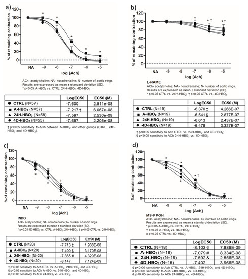 - Unfirer, S.; Mihalj, M.; Novak, S.; Kibel, A.; Cavka, A.; Mijalevic, Z.; Gros, M.; Brizic, I.; Budimir, D.; Cosic, A.; et al. Hyperbaric oxygenation affects the mechanisms of acetylcholine-induced relaxation in diabetic rats. Undersea Hyperb. Med. 2017, 43, 787–803. [Google Scholar]