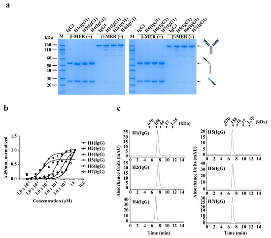 In order to produce and characterize the Fab binders in an IgG form, the individual VH and VL sequences from each of the Fab clones were cloned into heavy (IgG1 Fc) and light chain (Ck1) expression vectors, respectively. IgGs were expressed transiently in Expi293 cells and subsequently purified. As shown in Figure 3, the resulting IgGs were highly pure, with protein yields of 0.8 mg/L, 5.9 mg/L, 21.5 mg/L, 1.0 mg/L, 1.7 mg/L, and 17.4 mg/L for H1 (IgG), H2 (IgG), H4 (IgG), H5 (IgG), H6 (IgG), and H7 (IgG), respectively (Figure 3a). H3 (IgG) could not be purified due to its aggregating nature.