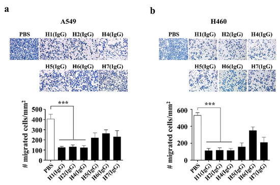 Trans-well migration assay of human anti-hYKL-40 IgGs. (a,b) Trans-well migration assay of human anti-hYKL-40 IgGs (H1 (IgG), H2 (IgG), H4 (IgG), H5 (IgG), H6 (IgG), and H7 (IgG)) on A549 (a) and H460 (b) cells to assess their inhibitory effects in cell migration. The number of migrated cells per square mm (mm2) was counted, plotted and compared to that of a negative control (PBS (phosphate-buffered saline)-treated). The data are presented as the mean ± SE (SEM). *** p < 0.001.