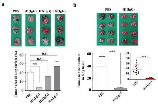 Based on our previous study, which revealed that the knock-down of YKL-40 suppressed cancer metastasis in lung cancer cell lines, A549 and H460) [41], we firstly wanted to know whether the anti-hYKL-40 IgGs could mimic the knock-down phenotype by antagonizing the activity of hYKL-40 in cancer cell migration. To address this, we adopted an in vitro trans-well migration assay to investigate their anti-metastatic activity in two different human lung cancer cell lines, A549 and H460 (Figure 4a,b, respectively). We found that all 6 anti-hYKL-40 IgGs significantly inhibited the migration in both the A549 and H460 cell lines. As shown in Figure 4a, 405 ± 21 cells/mm2 migrated to the lower side of the trans-well in the PBS-treated control group of A549 cells, while 124 ± 5, 132 ± 8, 124 ± 9, 220 ± 22, 263 ± 16, and 229 ± 27 cells/mm2 migrated to the H1 (IgG)-, H2 (IgG)-, H4 (IgG)-, H5 (IgG)-, H6 (IgG)-, and H7 (IgG)-treated groups, respectively. In Figure 4b, 529 ± 14 cells/mm2 migrated to the lower side of the trans-well in the PBS-treated control group of H460 cells. However, 112 ± 12, 117 ± 14, 114 ± 11, 158 ± 20, 349 ± 20, and 208 ± 28 cells/mm2 migrated to the H1 (IgG)-, H2 (IgG)-, H4 (IgG)-, H5 (IgG)-, H6 (IgG)-, and H7 (IgG)-treated groups, respectively. In order to further the in vivo study, we selected 3 anti-hYKL-40 IgGs (H1 (IgG), H2 (IgG), and H4 (IgG)), which showed a significantly higher degree of inhibition in the migration of the lung cancer cells. The 6 anti-hYKL-40 IgGs were further characterized on B16F10 mouse melanoma cells to assess their inhibitory effects in the migration of the melanoma cells prior to an in vivo assay on B16F10 cells. It was revealed that they all inhibited the migration in B16F10 cells as observed on the human lung cancer cells among which the 3 anti-hYKL-40 IgGs (H1, H2, and H4) were playing better compared to the others in antagonizing the cell migration (Figure S3).