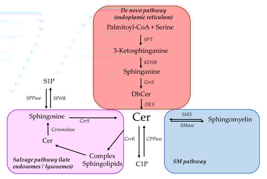 - Hannun, Y.A.; Obeid, L.M. Sphingolipids and their metabolism in physiology and disease. Nat. Rev. Mol. Cell Biol. 2018, 19, 175. [Google Scholar] [CrossRef]