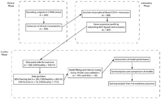 We made use of the CIRCULATING CELLS study cohort [20] to address the question of whether NGC expression profiles of circulating blood cells can be related to cardiovascular health. From 368 subjects out of this cohort (CVD patients and healthy controls), the transcriptomes of their CD14-positive monocytes were profiled (Figure 1). The individuals received different treatments and medications, and some of them suffered from other diseases, resembling the reality of complexity of most human cohorts (Table 1). Next, we aimed to classify CVD patients and healthy individuals using the differential expression of the NGC transcripts