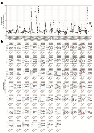 Neuroimmune guidance cues (NGCs) comprise the netrin, semaphorin, ephrin and slit families of proteins of ligands and receptors, which were originally characterized to direct cell and axon migration during neural development. In the last two decades, it has become increasingly clear that these proteins can also play a major role in (pathological) immune responses by directly regulating leukocyte trafficking and directly impacting the pathogenesis of atherosclerosis [8,9,10]. Indeed, numerous studies using murine atherosclerosis models have found multifaceted roles of NGCs in the development of atherosclerosis [11,12,13,14,15]. In addition, several observations also support a role for NGCs in human CVD. For instance, three NGC genes are located on human chromosome 1, in the locus that has been identified as the premature myocardial infarction susceptibility locus [16]. In addition, the axonal guidance pathway is found enriched with genetic variants that have significant associations with CVD, and several novel genetic risk loci for CVD contain NGCs genes [17,18]. However, whether the monocytic expression of NGCs is informative for human CVD has not been described yet.