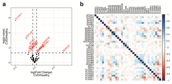 Univariate correlation of NGC expressions with disease phenotypes and pairwise correlations of NGC expressions. (a) Volcano plot showing the fold changes and the significance of difference in the 2 mean Student’s t-tests between NGC expressions in CVD patients and healthy individuals. NGCs with significant differences (p < 0.05) are labeled with gene names and red color. For most NGCs, the univariate correlation determined by the 2 mean Student’s t-tests with the outcomes is minimal. (b) Pairwise covariances of NGC expressions were illustrated in the heatmap to examine the between-feature correlations. Blue color indicates a positive correlation, whereas red color indicates a negative correlation. There are no absolute pairwise covariances higher than 0.75, the common cutoff for highly correlated features.