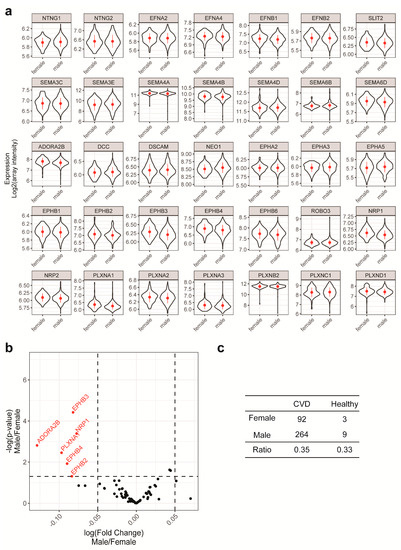Next, we examined the relationship of sex to NGC expressions and disease outcomes. Using violin plots, we compared the distribution of NGC expressions in both sexes (Figure 5a). The distribution of NGC expressions was barely affected by sex, including the X-linked PLXNA3, PLXNB3 and EFNB1 genes (Figure 5a). There were six NGCs with significantly different expressions comparing males to females, albeit with a very small fold change relative to the variations (Figure 5b). Cross-tabulations of sex and disease outcomes were made, and the frequency distribution of both genders was similar among CVD patients and healthy individuals (Figure 5c). Therefore, sex was also unlikely to be a confounding factor in this study. Regardless, sex and age were included in our modeling process, as it is common practice to control for these conventional confounding factors.