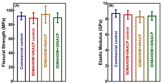 Mechanical properties of composites. (A) Flexural strength, and (B) elastic modulus (mean ± SD; n = 6). There was no significant difference among the four groups (p > 0.05).