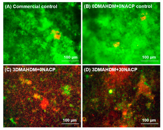 Figure 2 shows representative live/dead images of the saliva-derived biofilms on the composites. The commercial control and 0DMAHDM + 0NACP were covered by live bacteria. In contrast, 3DMAHDM + 0NACP and 3DMAHDM + 30NACP had substantial amounts of compromised bacteria with red staining.