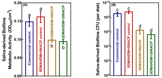 Lactic acid and polysaccharide production of 48 h saliva-derived biofilms on composites are plotted in Figure 4A,B, respectively (mean ± SD; n = 6). The biofilms on the two control composites produced the most acid and polysaccharides. The composites with 3DMAHDM + 0NACP and 3DMAHDM + 30NACP substantially reduced the acid and polysaccharide production of the saliva-derived biofilms (p < 0.05). These results demonstrate that 3DMAHDM + 0NACP and 3DMAHDM + 30NACP composite diminished the cariogenic abilities of the saliva-derived biofilms.