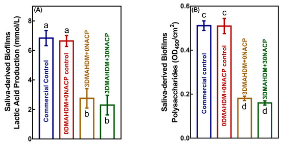 Inhibition effects of composites against cariogenic activities of saliva-derived biofilms (mean ± SD; n = 6). (A) Lactic acid production by saliva-derived biofilms. (B) Polysaccharide production by saliva-derived biofilms on composites. Values with dissimilar letters are significantly different from each other (p < 0.05).