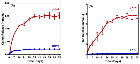 Next, 50 mmol/L lactic acid and 50 mmol/L HEPES were used to buffer the sodium chloride (NaCl) solution (133 mmol/L) into pH 4 and pH 7, respectively. Three specimens of 2 × 2 × 12 mm were submerged into 50 mL of a solution at each pH. This produced a specimen volume to solution ratio of 2.9 mm3/mL, which was similar to the previous specimen volume to solution ratio of approximately 3.0 mm3/mL [74]. The concentrations of Ca and P were measured at 1, 3, 7, 14, 21, and 28 days. At each time, an aliquot of 0.5 mL was removed and replaced with a fresh solution. The pH of the solution was checked and adjusted to pH 4 using the 50 mmol/L of lactic acid. The aliquots were analyzed for Ca and P ions using a spectrophotometric method (DMS-80 UV-visible, Varian, Palo Alto, CA, USA) with known standards and calibration curves [74].