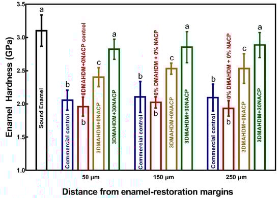 Enamel hardness for the four groups at three distances from the composite-enamel margins after saliva-derived biofilms acid attack with sucrose for 21 days (mean ± SD; n = 6). Values with dissimilar letters are significantly different from each other (p < 0.05).