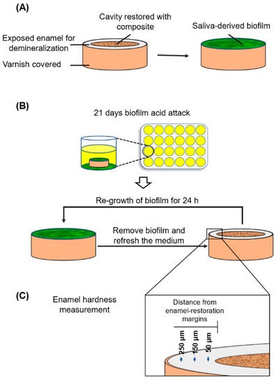 After 21 days of biofilm acid attack, Vickers hardness was measured on enamel surface near the enamel composite margin (Figure 7C). Three different distances from the interface of the cavity were chosen for hardness measurement: 50 μm, 150 μm, 250 μm, following a previous study [77]. Vickers indentation (HMV II; Shimadzu Corporation, Kyoto, Japan) was performed at a load of 50 g for a dwell time of 10 s [77]. Five indentations were made at each distance for each of six enamel samples for each composite. Healthy enamel hardness without biofilm attack was also measured as a control.