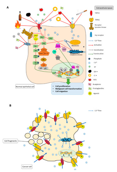 The complex role of transient receptor potential vanilloid 1 (TRPV1) and ankyrin 1 (TRPA1) ion channels in normal epithelial cell (A) and cancer cell (B). Panel A represents the TRPV1-, TRPA1-mediated signal transduction pathways of potentially carcinogenic exogenous compounds as well as endogenous ligands. Panel B illustrates the antitumor effect of TRPV1, TRPA1 receptor agonists on a cancer cell. Abbreviations: TRPV1: transient receptor potential vanilloid 1; TRPA1: transient receptor potential ankyrin 1; QH•: hydroxyl radical; -C•: carbon-centered radical; ROS: reactive oxygen species; GRB2: growth factor receptor-bound protein 2; MEK1/2: mitogen-activated protein kinase kinase; ERK: extracellular signal regulated kinase; PLC: phospholipase C; PKC: protein kinase C; CARD11: caspase recruitment domain-containing protein 11; Malt1: mucosa-associated lymphoid tissue lymphoma translocation protein 1; Bcl-10: B-cell lymphoma/leukemia 10; Ikss: IKK alpha + IKK beta; IKB: nuclear factor of kappa light polypeptide gene enhancer in B-cells inhibitor alpha; IP3: inositol trisphosphate; CALM: calmodulin; CaN: carbonic anhydrase 1; NFAT: nuclear factor of activated T-cells; CREB: cAMP-response element binding protein.