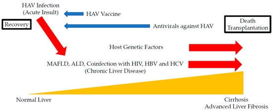 Effects of hepatitis A infection (HAV) on the prognosis of chronic liver disease. Possible acceleration and inhibition of the disease progression of hepatitis A are indicated by red and blue arrows, respectively. MAFLD, metabolic associated fatty liver disease; ALD, alcoholic liver disease; HIV, human immunodeficiency virus; HBV, hepatitis B virus; HCV, hepatitis C virus.