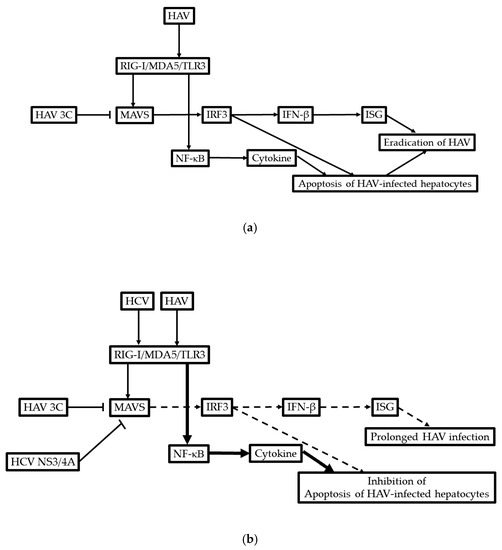 Possible molecular mechanism of the development of acute-on-chronic liver failure (ACLF) in patients coinfected with hepatitis A virus (HAV) and HCV. (a) Only HAV infection; (b) coinfection HAV and HCV. RIG-I, retinoic acid-inducible gene-I; MDA-5, melanoma differentiation associated gene 5; TLR3, toll-like receptor 3; MAVS, mitochondrial antiviral signaling protein; IRF3, interferon regulatory factor 3; IFN, interferon; ISG, interferon-stimulated gene; NF-κB, nuclear factor kappa B subunit 1.