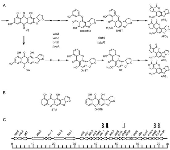 A. nidulans, A. versicolor and various fungal species are known to produce sterigmatocystin (ST) as a final product [,,,,,]. ST is one of the latter intermediates in the biosynthesis of AF. In fact, the enzymes, the intermediates, and the reactions for the biosynthesis of ST in A. nidulans are the same as those for AF biosynthesis [,,].