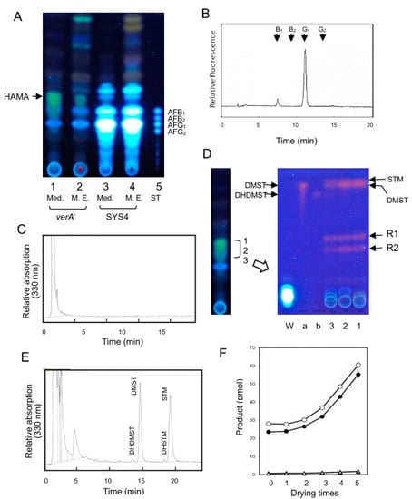 Our present results demonstrated that HAMA can non-enzymatically change to DMST and STM at the ratio of ~1:1 in their quantities (Figure 3D–F and Figure 5B). The yellow color of the spots of HAMA on the TLC plates changed to dark red, which is the same color as those of ST derivatives such as DMST and STM under UV light. The repetitions of the drying and solubilization of the HAMA increased the amounts of DMST and STM. These results indicated that decarboxylation, dehydration, and dehydrogenation can occur spontaneously. Since STM did not serve as a precursor of AFs in the feeding experiment with NIAH-26 mutant, we speculate that STM is an artificial dead-end product from intermediate 8.