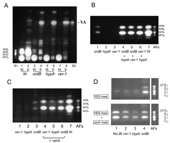 Culture media as well as mycelial extracts of the ver-1, hypA, and ordB disruptants were analyzed by TLC after tip culture. They predominantly accumulated VA as a major intermediate in their mycelia (Figure 4A). Each of the disruptants also produced smaller amounts of some substances, which appeared to be different depending on the disruptant. When each substance was extracted from a TLC spot and then analyzed by HPLC, we observed that the hypA disruptant accumulated a small amount of 6-deoxyversicolorin A (deoxyVA) together with VA. The ver-1 and hypA disruptants completely lost AF productivity, whereas the ordB disruptant produced small amounts of AFs (Figure 4A). To investigate relationship among ver-1, hypA, ordB, and verA genes in AF biosynthesis, we co-cultured each combination of two of them and analyzed AFs contained in the resulting culture medium (Figure 4B,C). All combination enhanced AF production, indicating that all genes have different functions each other although all accumulated mainly VA.
