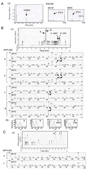 The LC-MS analysis using condition [A] revealed that HAMA purified by TLC had a peak whose retention time was at 6.11 min in the LC chromatogram (Figure 5A). HAMA’s molecular related ions in electrospray ionization-mass spectrometry (ESI-MS) spectra were observed at m/z 374.9 [M + H]+ (100%) or 373.0 [M−H]− (100%) and 747.3 [2M−H]− (32%), indicating that the molecular mass of HAMA is 374 (Figure 5A).