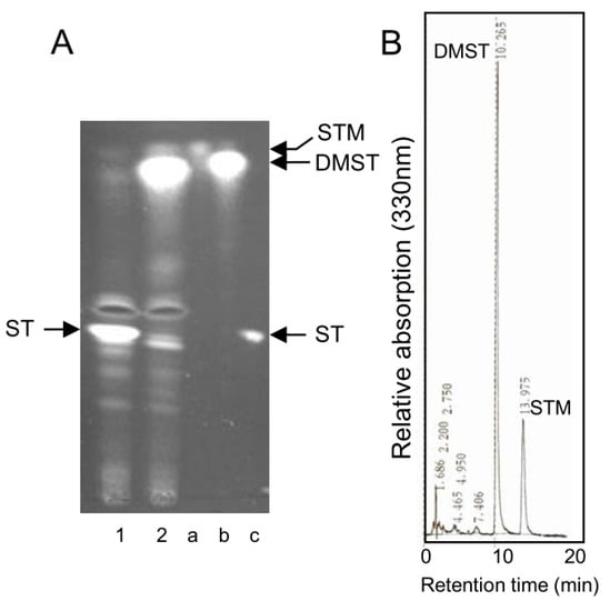 2.5. Accumulation of Small Amounts of STM Together with DMST in A. nidulans stcP-Disruptant