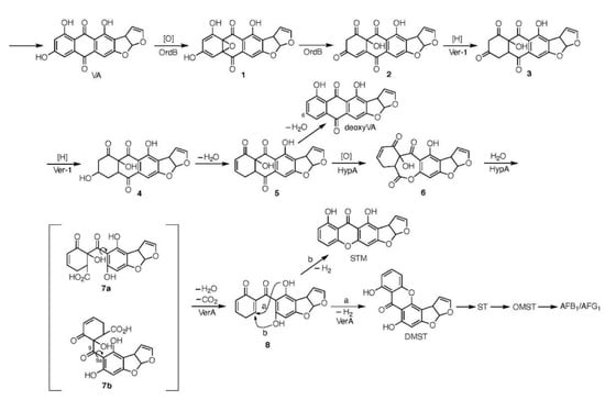Therefore, VerA enzyme is the key enzyme for the formation of the xanthone structure of various ST derivatives. Since acute toxicity and carcinogenicities have been reported after xanthone structure formation, VerA enzyme is also involved in the appearance of these toxicities. We also speculate that because aflatoxigenic fungi produce 2-group AFs (AFB2 and AFG2) together with 1-group AFs (AFB1 and AFG1), VerA enzyme is involved in the reaction from VB to DHDMST through the formation of DHHAMA.