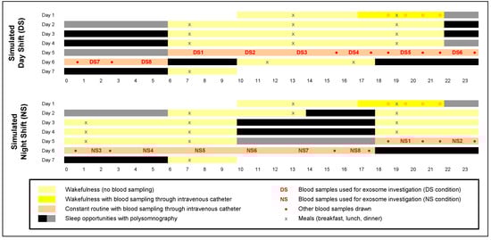 - Khalyfa, A.; Poroyko, V.A.; Qiao, Z.; Gileles-Hillel, A.; Khalyfa, A.A.; Akbarpour, M.; Almendros, I.; Farre, R.; Gozal, D. Exosomes and metabolic function in mice exposed to alternating dark-light cycles mimicking night shift work schedules. Front. Physiol. 2017, 8, 882. [Google Scholar] [CrossRef]