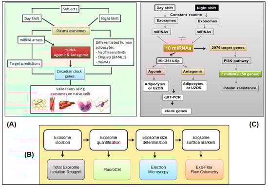 Khalyfa, A.; Gaddameedhi, S.; Crooks, E.; Zhang, C.; Li, Y.; Qiao, Z.; Trzepizur, W.; Kay, S.A.; Andrade, J.; Satterfield, B.C.; et al. Circulating Exosomal miRNAs Signal Circadian Misalignment to Peripheral Metabolic Tissues. Int. J. Mol. Sci. 2020, 21, 6396. https://doi.org/10.3390/ijms21176396