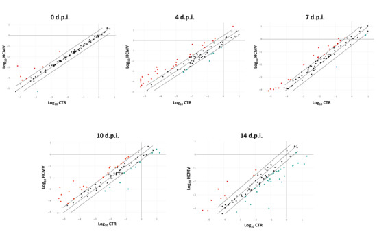 Scatterplot representation of the apoptosis-associated factors altered by human cytomegalovirus (HCMV) infection in primary human dermal fibroblasts. At each time p.i. (d.p.i. = days post-infection), cell samples were collected and analyzed by specific qPCR microarray. The significance threshold was put at 3-fold expression change in infected vs. uninfected control cells. Red dots: upregulated factors; blue dots: downregulated factors; black dots: not significantly altered factors. Results represent mean values of duplicate samples from two independent experiments, and are expressed in logarithmic scale (Log10 HCMV = logarithmic values in HCMV infected cells; Log10 CTR = logarithmic values in control uninfected cells).