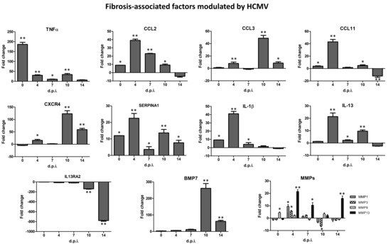 In particular, HCMV infection led mainly to the over-expression of CCL2, CCL3, CCL11, CXCR4, IL-1β, IL13, MMP1, MMP3, MMP9 and MMP13, SERPINA1, TNFα, and BMP7, and the gradual and constant downregulation of IL13RA2 (up to almost 800-fold at 14 days p.i.).