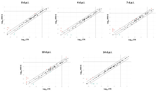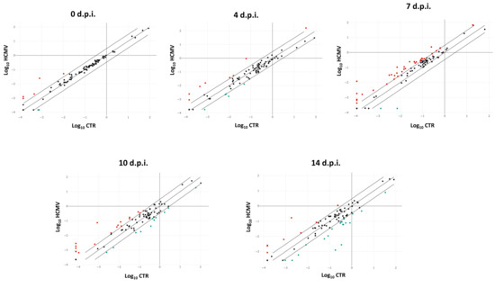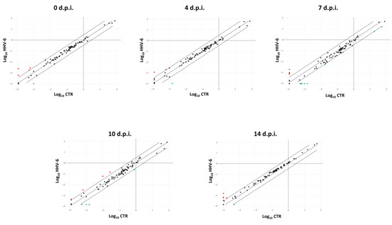 Scatterplot representation of the fibrosis-associated factors altered by human herpesvirus 6A (HHV-6A) infection in primary human dermal fibroblasts. At each time p.i. (d.p.i. = days post-infection), cell samples were collected and analyzed by specific qPCR microarray. The significance threshold was put at 3-fold expression change in infected vs. uninfected control cells. Red dots: upregulated factors; blue dots: downregulated factors; black dots: not significantly altered factors. Results represent mean values of duplicate samples from two independent experiments, and are expressed in logarithmic scale (Log10 HHV-6 = logarithmic values in HHV-6A-infected cells; Log10 CTR = logarithmic values in control uninfected cells).