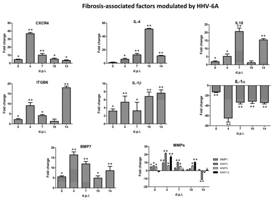 Additionally, HHV-6A exhibited a profound modulating effect on several fibrosis-associated factors. In particular, CXCR4 resulted highly upregulated at 4 and 7 days p.i. (up to >36 fold), IL-1β was constantly upmodulated (up to >7 fold), four MMPs were overexpressed (MMP1-3-9-13, up to 21 fold), and also IL-4 (>51 fold), IL-10 (>20 fold), and TNFα (>28 fold) were upregulated by the virus, together with BMP7 (>16 fold), similarly to HCMV.