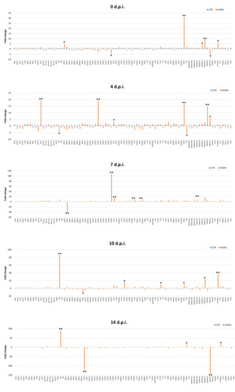 Other induced factors, although to a lesser extent, included Chemokine (C-C motif) ligand 11 (CCL11; 3.9 fold), Matrix Metalloproteinase-9 (MMP9; 4.39 fold), and Bone Morphogenic Protein 7 (BMP7; 3.44 fold). At day 4 p.i., 15 transcripts associated with fibrosis were highly upregulated. In detail, CCL11 (43.1 fold), CCL2 (39.13 fold), IL-1β (41.08 fold), TNFα (30.6 fold), and Plasminogen (PLG; 26.29 fold) transcripts resulted strongly upregulated, followed by SERPINA1 (22.53 fold), Interleukin 13 (IL-13; 21.39 fold), Matrix Metalloproteinase-3 and -13 (MMP3, 5.8 fold; MMP13, 21.51 fold), Chemokine Receptor type 4 (CXCR-4; 15.82 fold), Hepatocyte Growth Factor (HGF; 11.59 fold), Fas ligand (FASLG or CD95L; 9.48 fold), Matrix Metalloproteinase-1 (MMP1; 9.51 fold), Chemokine (C-C motif) ligand 3 (CCL3; 7.96 fold), and BMP7 (6.65 fold). In the following days p.i., CCL2 transcript continued to be significantly upregulated at days 7 and 10 p.i. (23.1 and 9.29 fold, respectively); BMP7 and CXCR-4 resulted the most upregulated factors at day 10 p.i. (261.31 and 123.08 fold, respectively) with CCL3 (48.74 fold), TNFα (34.21 fold), SERPINA1 (13.67 fold), and IL-13 (9.61 fold). At day 14 p.i., a significantly high expression was observed for BMP7 (61.34 fold), CXCR-4 (59.15 fold), MMP13 (15.94 fold), SERPINA1 (7.69 fold), and TNFα (6.92 fold). Finally, the expression of IL-13 receptor subunit alpha 2 (IL13RA2) resulted gradually downregulated at day 4 p.i. (13.42 fold), at day 7 p.i. (17.57 fold), and at day 10 p.i. (138.44 fold), with a strong decrease observed at day 14 p.i. (776.73 fold).