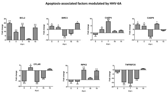 As to HHV-6A, only BCL2 was constantly upregulated (>19 fold), whereas the other factors exhibited a bi-phasic trend, with upregulation at certain times p.i. and downregulation at the others. Altered factors included BIRC3, CASP4, CASP9, CFLAR, RIPK2, and TNFRSF25 (mostly downregulated by the virus).