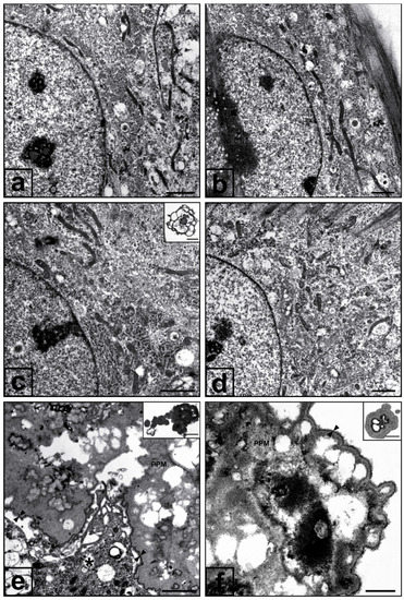 Western blotting assays revealed cPLA2α amounts in 3.0-Pi-LPS-CM-Dex cultures (Figure 3a,a1) and 2.0-Pi-LPS-CM-Dex cultures (Figure 3b,b1) were significantly less than those in their counterparts not subjected to dexamethasone supplementation, with enzyme content reaching values identical to those in controls for both cultures. Occurrence of dexamethasone-dependent inhibition of gene expression was also observed, since qPCR-estimated cPLA2α mRNA content in 2.0-Pi-LPS-CM-Dex cultures was significantly less than that in 2.0-Pi-LPS-CM cultures, with values very close to those in controls (Figure 3c). An analogous inhibitory effect also resulted for cPLA2α mRNA amounts in 3.0-Pi-LPS-CM-Dex cultures (not shown). Ultrastructurally, normal features as those characterizing AVICs from 6- (Figure 4a) and 21-day-long control cultures (Figure 4b) were observed for most AVICs from 3.0-Pi-LPS-CM-Dex cultures (Figure 4c) and 2.0-Pi-LPS-CM-Dex cultures (Figure 4d). Advanced pro-calcific patterns showing the genesis of PPL-lined multivesicular cell remnants and/or calcospherulae were more frequently observed in 3.0-Pi-LPS-CM-Dex cultures (Figure 4c inset) than 2.0-Pi-LPS-CM-Dex cultures, although pro-calcific end products were far fewer than those usually detectable in 3.0-Pi-LPS-CM cultures (Figure 4e, 4e inset) and 2.0-Pi-LPS-CM cultures (Figure 4f, 4f inset), respectively. AVICs from control Dex cultures showed normal features, revealing that no dexamethasone-dependent cell alterations took place (not shown).