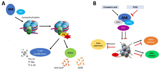 (A) Mechanism of homocitrulination and anti-CarP and anti-citrullinated protein (ACPA) antibody production. AhR recruits CPS1, which is responsible for homocitrulination of H1K34. H1K34hct enhances PADI2 expression, affects proliferation of T cells and production of IL-10 and the pro-inflammatory cytokines IFN-γ and IL-17. PADI2 plays a role in anti-CarP and ACPA antibody production. (B) Histone acetylation mediated by AhR. Cinnabaric acid (but not 2,3,7,8-tetrachloro- dibenzo-p-dioxin (TCDD)) activates AhR which recruits MTA2. Complex AhR/ARNT -MTA2 leads to transcriptional activation of STC2. MTA2 takes part in acetylation of histone 4. STC2 reveals anti-inflammatory properties which have been implicated into MSC therapy. STC2 also activates STAT3 signaling.