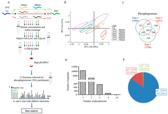 The phosphoproteomes of L4 nematodes subjected to different temperatures for different amounts of time were systematically studied by labeling with iTRAQ 8-plex reagents. This included L4 larvals, L4 larvals treated for 10 min or 60 min at 15 °C, 20 °C and 25 °C (six samples), and a mixture of all samples. The labeled peptides were fractionated by HPLC, combined, and then enriched by TiO2-affinity chromatography. A total of 12 fractions for each biological replicate were subjected to LC-MS/MS analysis (Figure 1A).