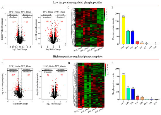 To further study the exact biological mechanisms of phosphoproteomes in nematodes exposed to various temperatures over a short period of time, differentially regulated phosphopeptides were graphically shown in volcano plots based on the criteria (fold change ratios ≥ 1.2 or ≤ 0.83 and p-value < 0.05). According to the results of the volcano plots (Figure 2A,B and Supplementary Table S2), a total of 500 differentially regulated phosphopeptides were acquired from 374 DRPs in C. elegans at 15 °C (217 up-regulated; 283 down-regulated), whilst 428 phosphopeptides were statistically significantly associated with 347 DRPs (115 up-regulated; 313 down-regulated). The significantly altered phosphorylation status of differentially regulated phosphopeptides induced by exposure to various temperatures for 10 min or 60 min was visualized using a heatmap (Figure 2C,D and Supplementary Table S2). The subcellular localization of differential phosphoproteins was intracellular for more than 90% of proteins, of which about 50% of phosphoproteins were located in the nucleus, indicating a rapid response to temperature changes and the regulation of genetic information involved in many biological processes (Figure 2E,F).
