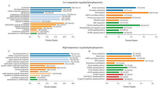 Taken together, the BP and KEGG enrichment analysis results were similar for low- and high-temperature samples, indicating that these physiological functions are driven by extensive phosphorylation alterations following temperature changes.