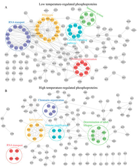 To provide insight into the possible cellular mechanisms, comprehensive protein–protein interactions (PPI) were used to depict numerous biological aspects of complex regulatory network and signaling pathways [32]. Hence, we used STRING11.0 to construct PPI networks for DRPs at 15 °C. As a result, we discovered that these DRPs might play important roles in translation, RNA transport, chromatin organization, immune system, and calcium signaling pathway (Figure 4A and Supplementary Table S4). In contrast, the highly clustered DRPs at 25 °C were related to spliceosome, the longevity pathway, chromatin organization, and RNA transport (Figure 4B and Supplementary Table S4). These results were similar to those found in the biological processes and KEGG enrichment analyses at 15 °C and 25 °C, further indicating that these processes and pathways may play important roles in early short-term temperature-stress-induced alterations.