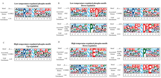 The features of enriched phosphorylation motifs. (A) Enriched phosphorylation motif of peptides upregulated at 15 °C. (B) Enriched phosphorylation motifs of peptide downregulated at 15 °C. (C) Enriched phosphorylation motif of peptides upregulated at 25 °C. (D) Enriched phosphorylation motifs of peptide downregulated at 25 °C.